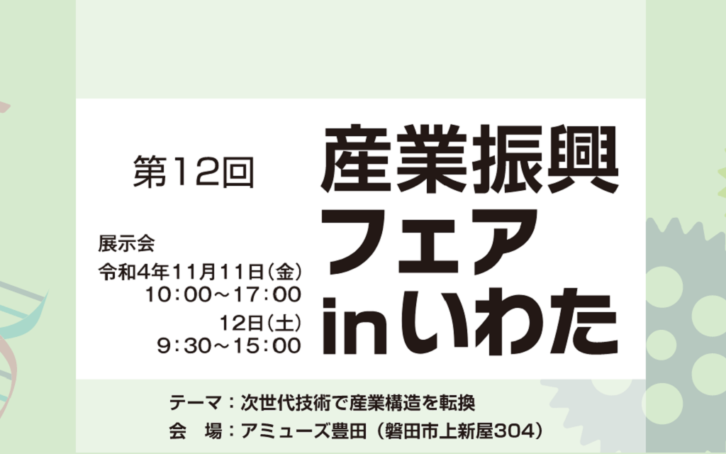 展示会出展情報「第12回 産業振興フェアinいわた」 2022.10.31 Mon, 社外行事 ○ 開催日 令和4年11月11日(金) 10時00分~17時00分 12日(土) 09時30分~15時00分 ○ 会場 アミューズ豊田 磐田市上新屋304 駐車場有 ・県道413号線(旧国道1号線)「弥藤太島」交差点を北へ約800m ・磐田バイパス「森岡IC」より北へ約100m ・東名高速道路「遠州豊田スマートIC」より約10分 是非お立ち寄りください。 次の記事 > < 前の記事 ブログ一覧へ