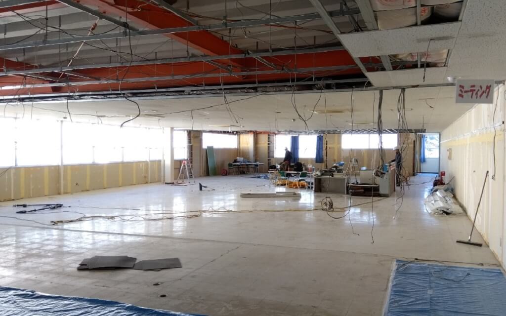 食堂の改修工事が始まりました 2024.02.27 Tue, Topics 2月中旬から食堂の改修工事が始まりました。 今回の改修工事では食堂とミーティングルームの壁を取り壊し、食堂スペースの拡張と会議室を3部屋増設する予定です! ~改修工事前の食堂~ ~改修工事後の食堂(予定)~ 工事の作業風景は随時ブログで紹介いたします。 ~壁等撤去作業~ ~壁等撤去作業後の風景~ 次の記事 > < 前の記事 ブログ一覧へ