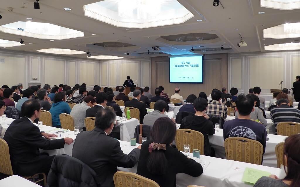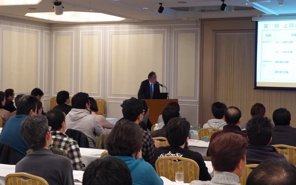 下期方針発表会では、社長や各部署の責任者から上期の実績と反省点の報告、